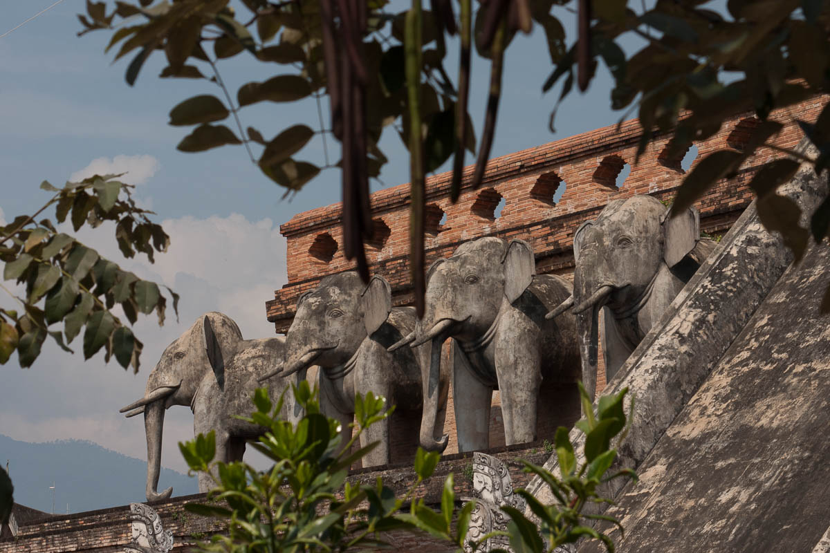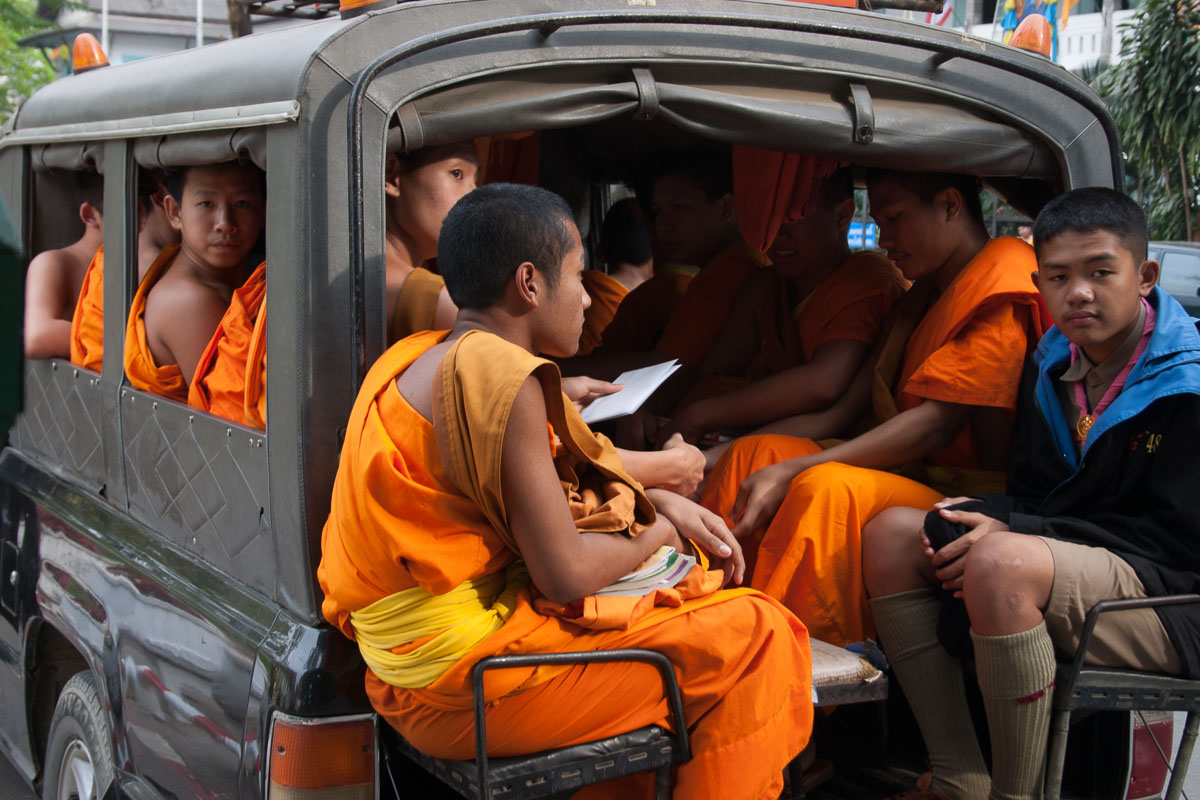 Wij zijn onmogelijke reizigers! We willen graag de pure kanten van Thailand zien, zonder hordes toeristen, zonder het onophoudelijke getoeter van auto’s, muziek, reclames, televisies en zeker niet dat allemaal tegelijk. Maar we willen ook een fijn hotel met een goede douche, een lekker bed in een rustige omgeving met een goede keuken. Blijkbaar gaat dat niet samen. Kortom, we zijn terug in de toeristen-enclave Chiang Mai met zijn positieve en negatieve kanten. We hebben heerlijk vis gegeten in ons favoriete marktrestaurant, een papaya gekocht bij onze favoriete jongens, mango met kleefrijst en kokossaus gegeten, ons favoriete dessert. We hebben ook in een tuk-tuk (een soort karretje met brommermotor als taxi) in de uitlaatgassen heel Chiang Mai drie keer rond gereden om een leuk hotel te vinden (wat we wilden was volgeboekt). Op de foto is Henk niet op weg naar een bankoverval, maar hij beschermt zich een beetje tegen uitlaatgassen.